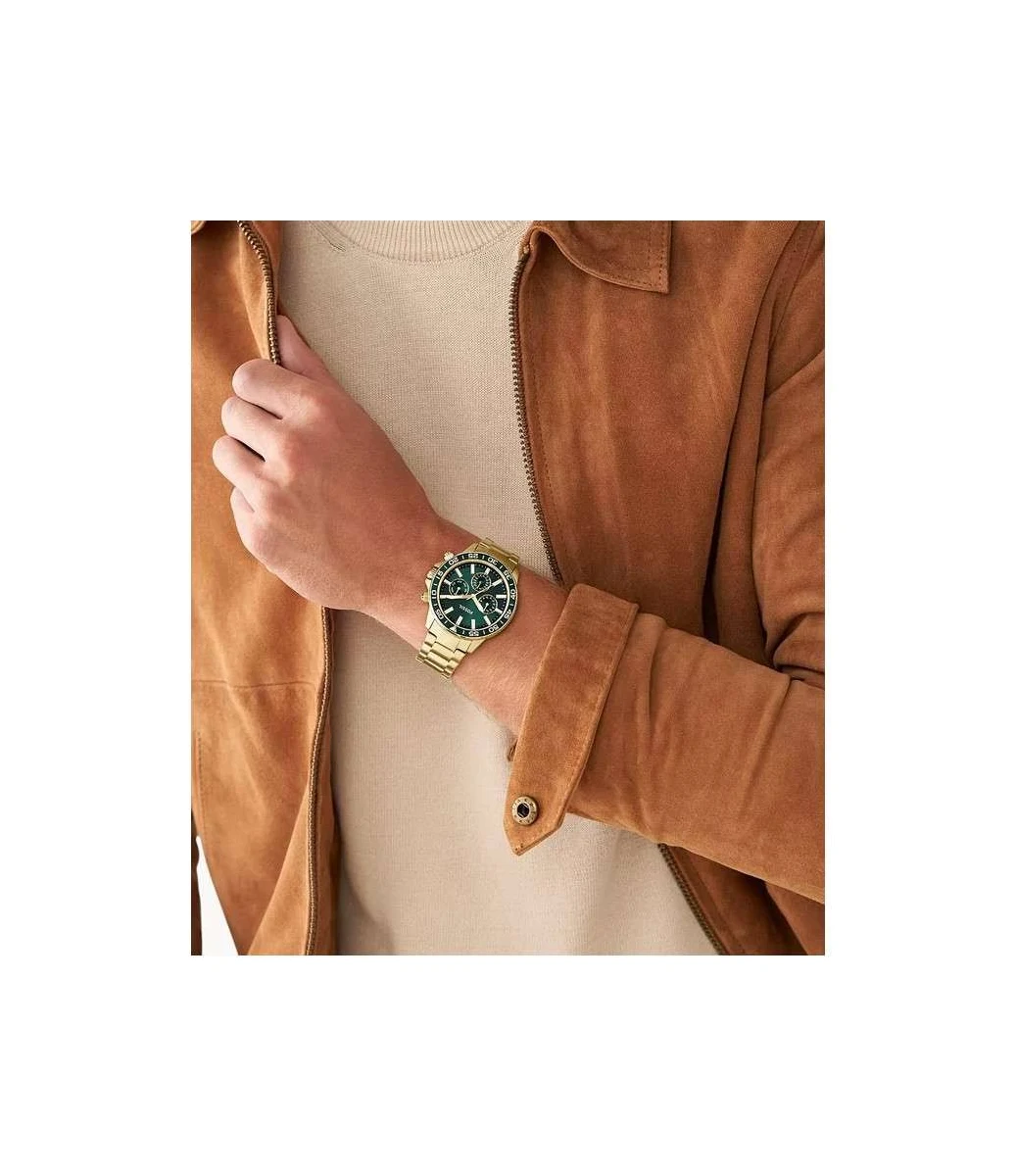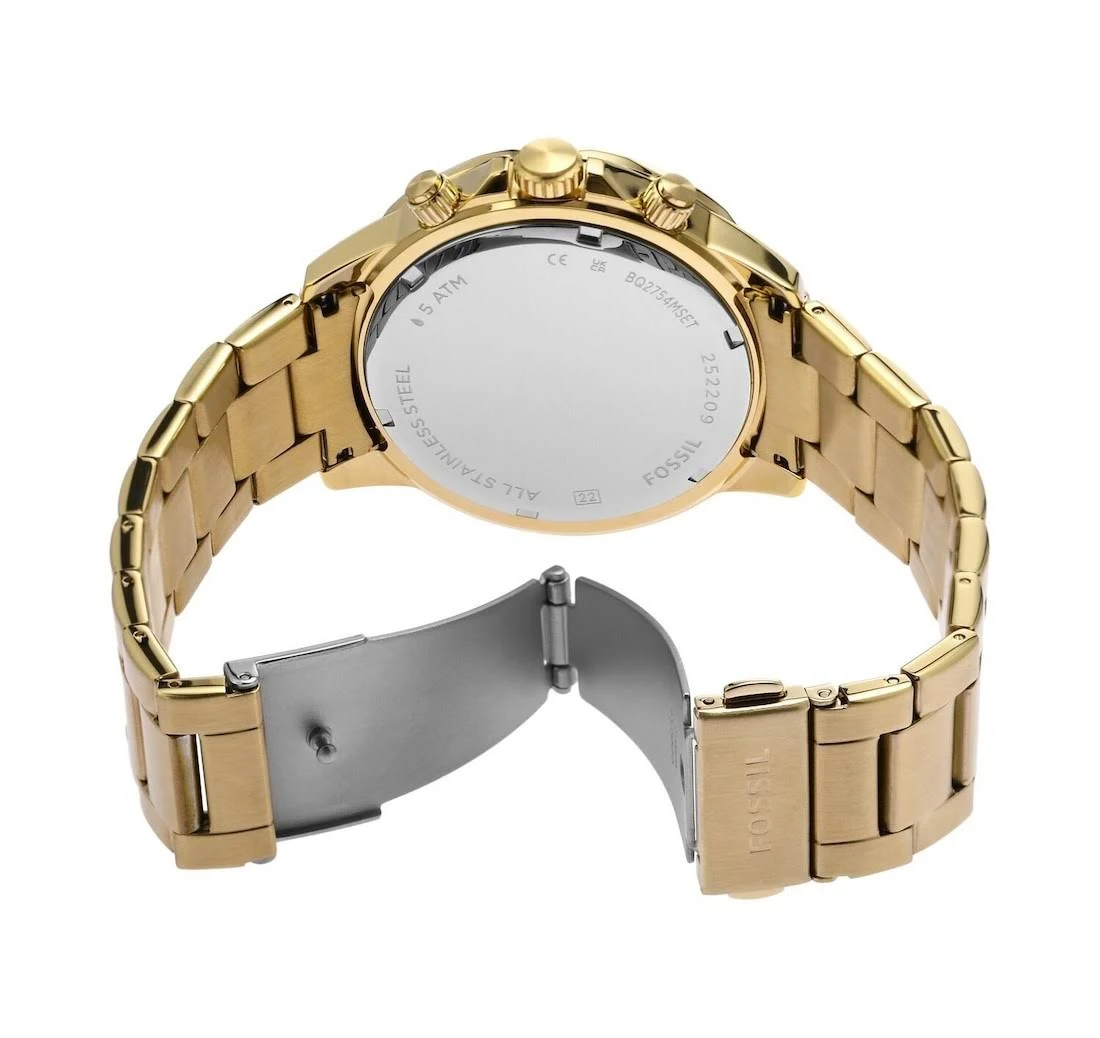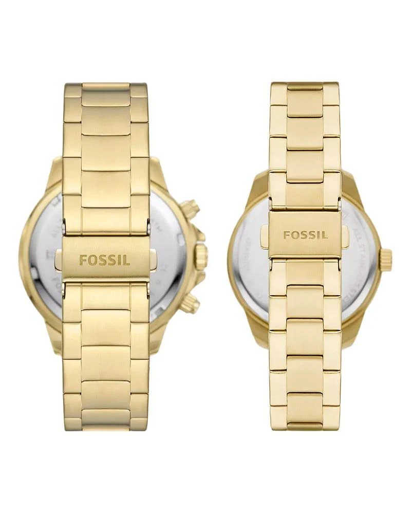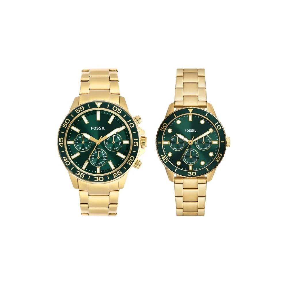 The Fossil Bannon Gold Watch Set (Model BQ2754SET) is an elegant matching timepiece set designed for couples who appreciate coordinated style and functionality. The set includes two watches: a bold 45 mm men’s Bannon watch and a proportionally sized 38 mm women’s Bannon watch, both finished in a striking gold-tone stainless steel and fitted with green sunray dials that contrast beautifully with the metallic finish.