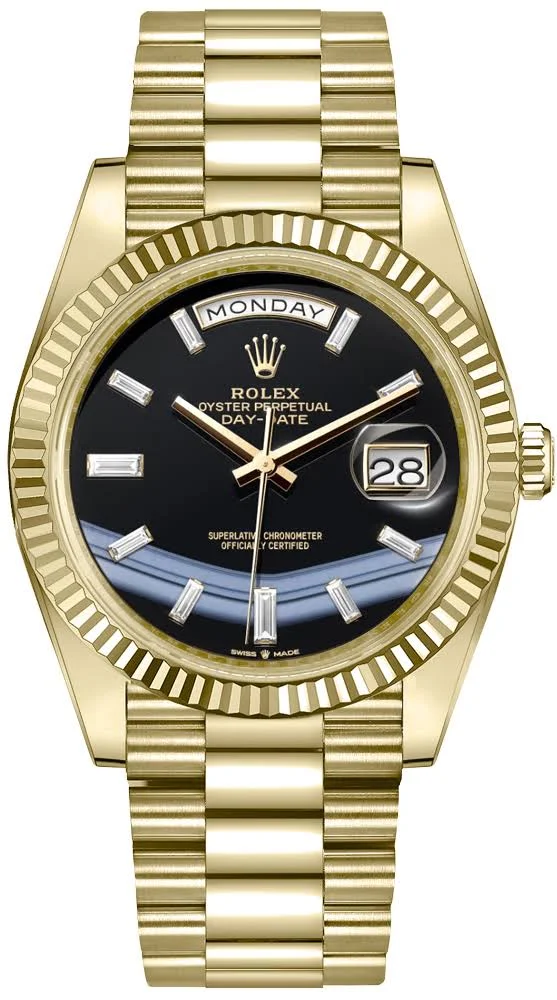 ### Rolex Day-Date 40 Onyx Dial Baguette Diamonds Men’s Watch 228238-0059 – A prestigious Swiss-made luxury men’s watch from Rolex’s iconic Day-Date 40 collection, featuring a 40 mm 18 kt yellow gold case, deep onyx dial with 10 baguette-cut diamond hour markers, automatic Calibre 3255 movement, and a president bracelet — combining timeless elegance with top-tier precision and craftsmanship.